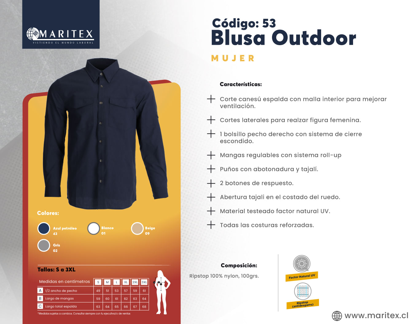 La Blusa Outdoor es ideal para días en exteriores, uniendo resistencia y elegancia en un diseño femenino con ajuste favorecedor. Confeccionada en nylon ripstop, brinda durabilidad y resistencia a rasgaduras. Se seca rápidamente, ofreciendo comodidad y durabilidad durante largas jornadas, mientras que el factor UV integrado protege la piel de la exposición solar.