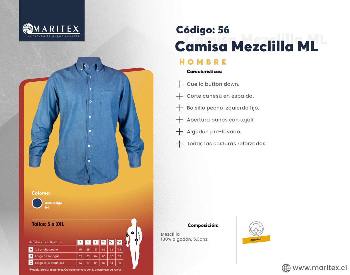 Esta camisa de mezclilla para hombre, confeccionada en 100% algodón, es ideal para el entorno laboral. Su diseño atemporal ofrece un toque profesional y pulido, mientras que el tejido de algodón proporciona comodidad y resistencia durante el día. Perfecta para quienes desean un estilo relajado pero refinado en el trabajo.