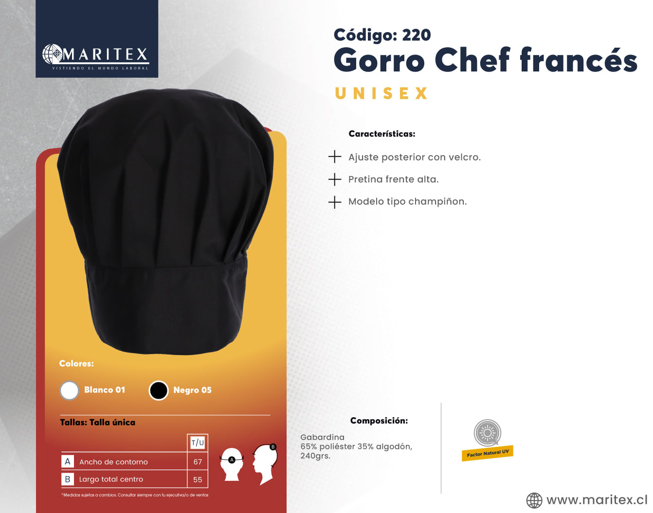 Gorro chef Francés, ideal para profesionales de la cocina. Confeccionado en material duradero, este gorro ofrece un ajuste personalizable para mayor comodidad. Su diseño clásico asegura una apariencia profesional, mientras mantiene el cabello bajo control en entornos culinarios. Perfecto para chefs y cocineros que buscan una prenda funcional y estilizada.