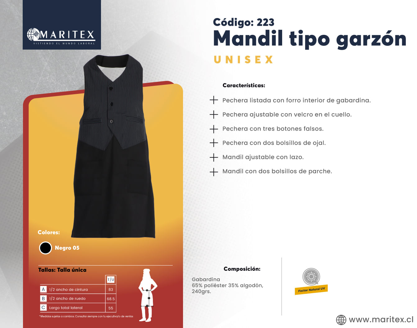 El Mandil de garzón es perfecto para el entorno de restaurantes y bares. Hecho de material resistente y fácil de mantener, cuenta con tirantes ajustables para un ajuste cómodo. Su diseño tipo gillette ofrece una cobertura práctica y profesional, además de bolsillos frontales para facilitar el acceso a utensilios y objetos pequeños. Ideal para quienes necesitan un mandil duradero y funcional en su día a día laboral.