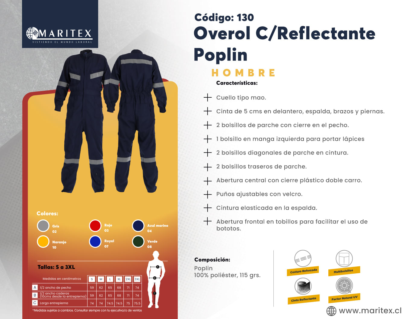 Este overol, ideal para el trabajo, incluye cintas reflectantes que aumentan la visibilidad en condiciones de baja luz. Su diseño práctico ofrece una solución funcional, proporcionando confort y protección esenciales para el entorno laboral, perfecto para quienes necesitan una opción accesible y eficaz.