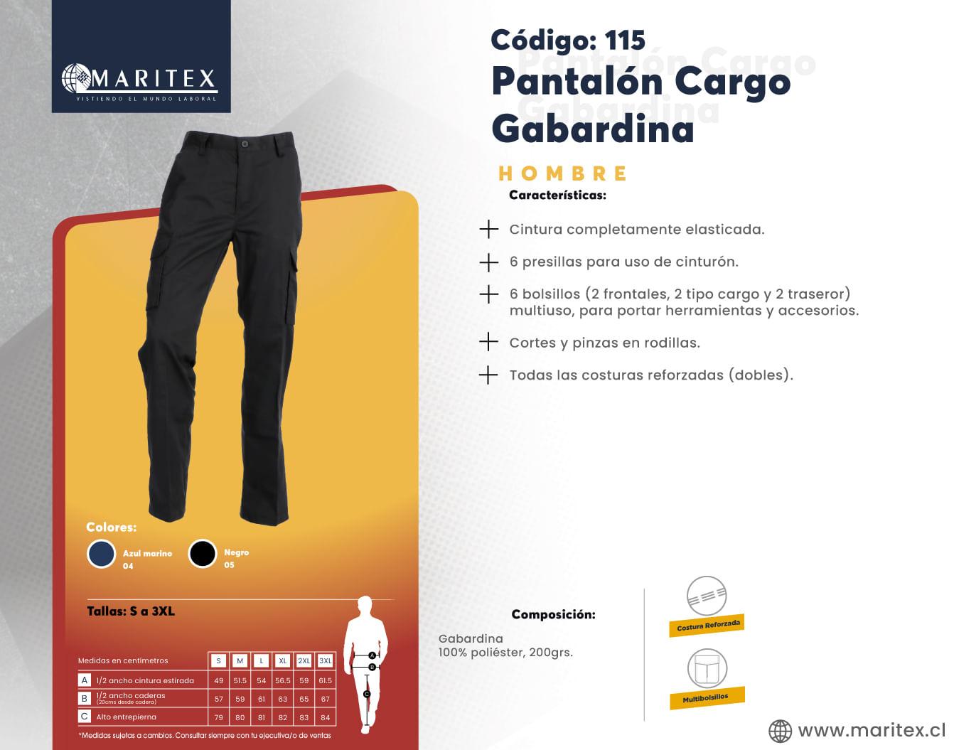 Este pantalón de gabardina para hombre está diseñado para el trabajo con un enfoque en durabilidad y visibilidad. Sus bolsillos cargo proporcionan un almacenamiento práctico y accesible para herramientas y objetos esenciales. Las cintas y detalles reflectantes aumentan la visibilidad en condiciones de baja luminosidad, ofreciendo una capa adicional de seguridad. Perfecto para jornadas laborales exigentes, combina resistencia, funcionalidad y protección para un rendimiento óptimo en el trabajo.