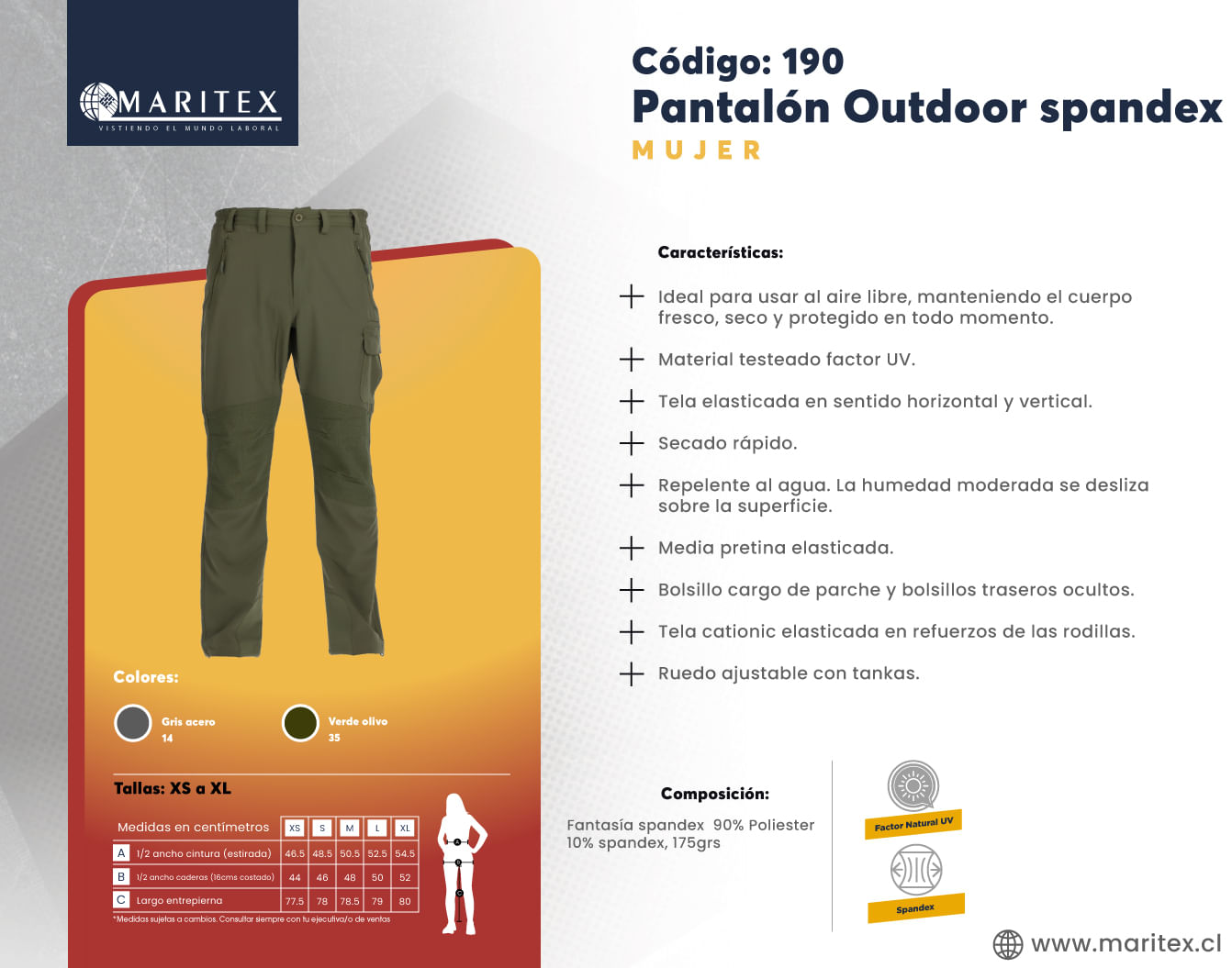 El pantalón Spandex, es perfecto para actividades al aire libre. Con filtro UV, secado rápido, y propiedades respirables, ofrece una protección completa y comodidad superior. Su diseño funcional asegura que te mantengas cómoda y seca durante todo el día, ideal para jornadas prolongadas en exteriores.
