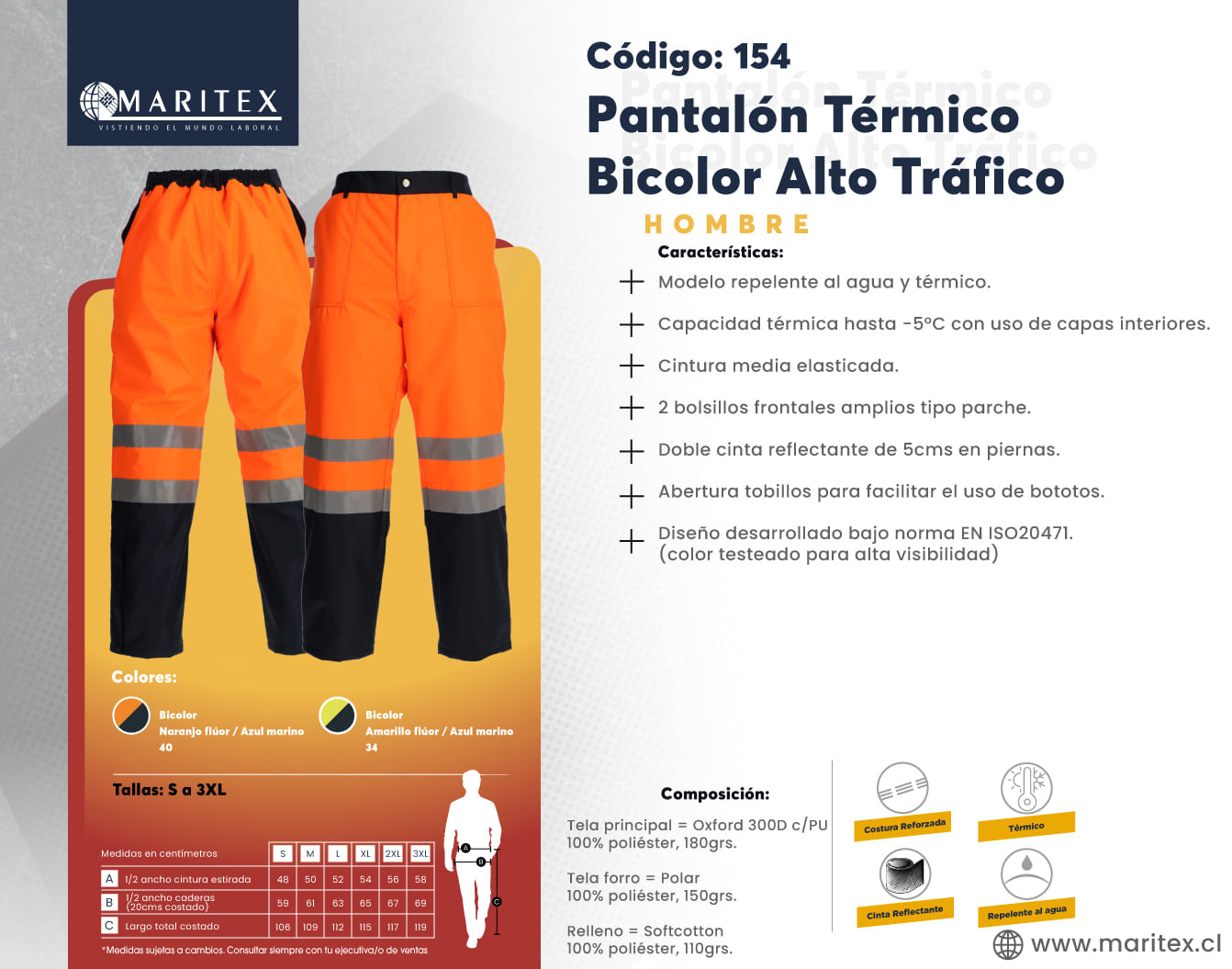 Este Pantalón Térmico Bicolor de alta visibilidad completa el conjunto perfecto junto a la parka. Con un forro de polar para máxima calidez y materiales impermeables, ofrece protección contra el frío y repelencia al agua. Las cintas reflectantes en las piernas aseguran que seas visible en condiciones de poca luz, mientras que su diseño ergonómico permite una gran movilidad. Ideal para trabajos al aire libre, este pantalón garantiza comodidad y seguridad.