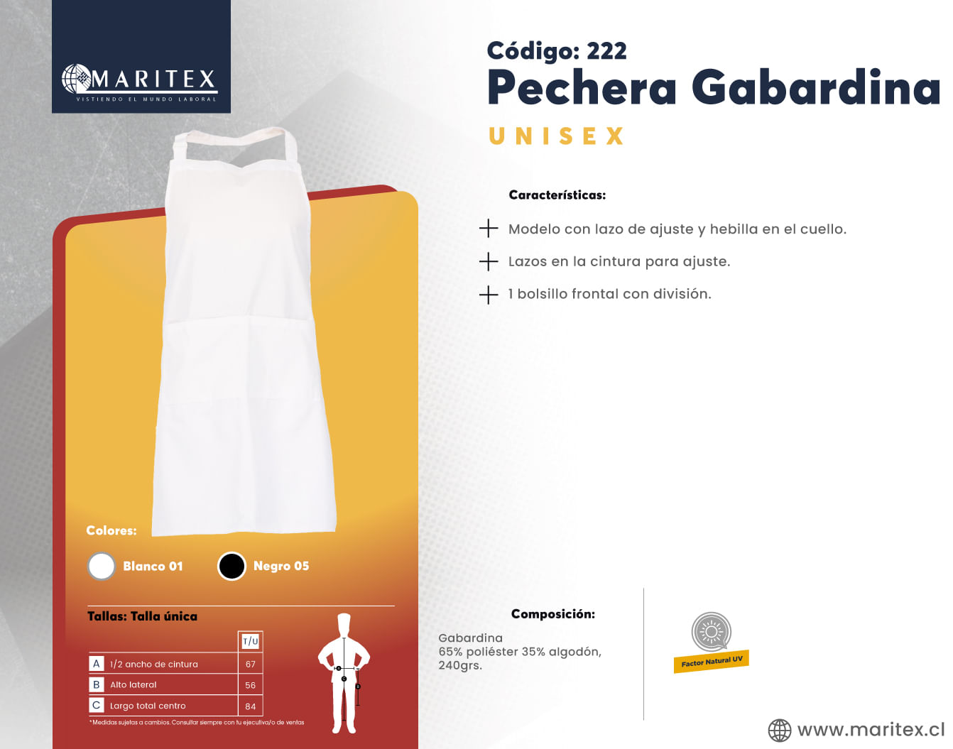 Esta pechera, es ideal para el entorno culinario, combinando durabilidad y estilo. Su tejido resistente y fácil de mantener asegura una larga vida útil, mientras que su diseño adaptable se ajusta cómodamente a diferentes tallas. Perfecta para protegerte de salpicaduras y manchas, su corte clásico ofrece un look profesional en la cocina. Ideal para chefs de cualquier género, proporciona comodidad y resistencia en cada servicio.